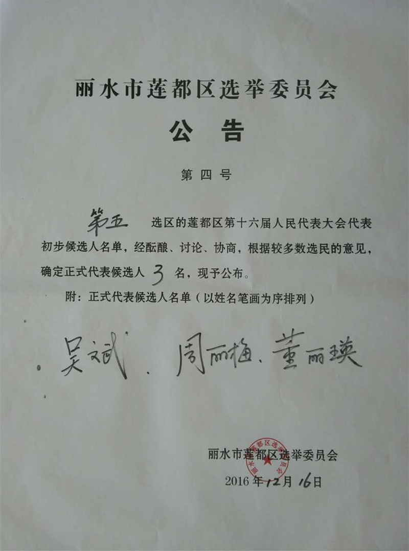 麗水市蓮都區(qū)選舉委員會(huì)公告(第一號(hào))