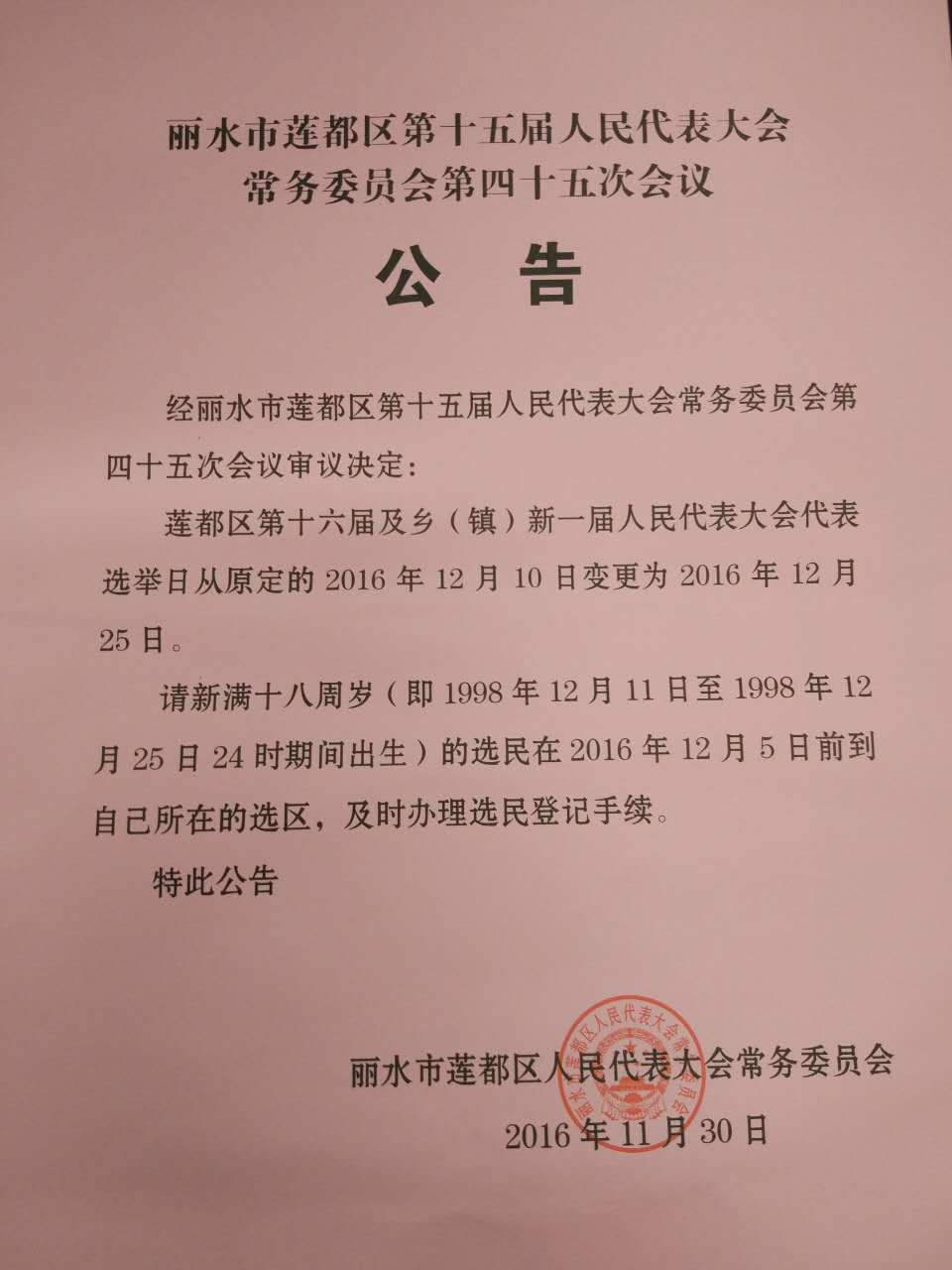 蓮都區(qū)人大常委會關于變更選舉日期的公告