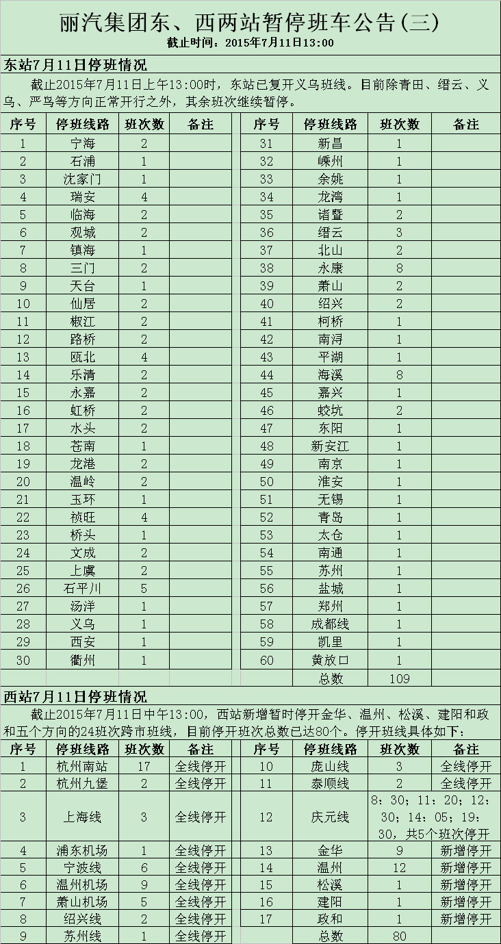 截止7月11日13:00,麗汽集團東、西兩站班車停復(fù)班情況: