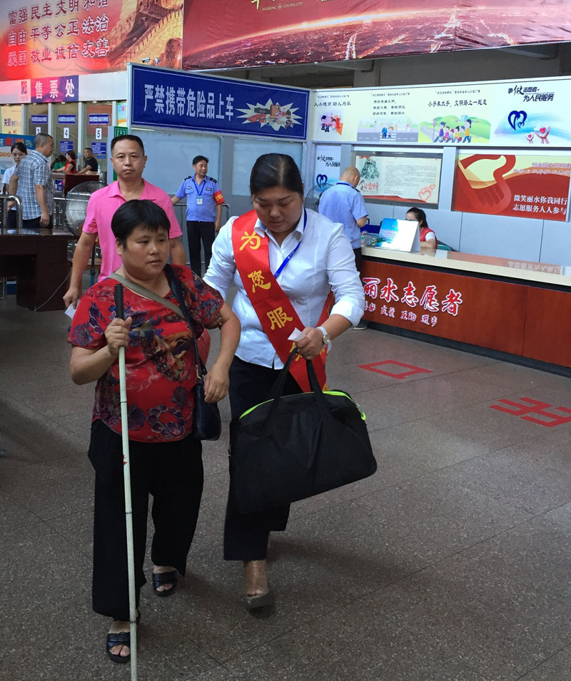 大姐的眼睛因為一年前得了疾病導致看不見,今天到東站準備坐車去縉云。當時正在售票廳引導一米線的毛麗珍看到了正慢慢摸索、一步步小心翼翼往前走的大姐。她趕緊上前扶著大姐并幫她購買了去縉云的車票,看她行走不方便,毛麗珍就一路扶著她,并一直送她到車上。別看毛麗珍人長得大個,可她的心卻細著,哪里需要轉(zhuǎn)彎,哪里有臺階,哪里需要注意的,她都一一耐心的提醒大姐小心注意。